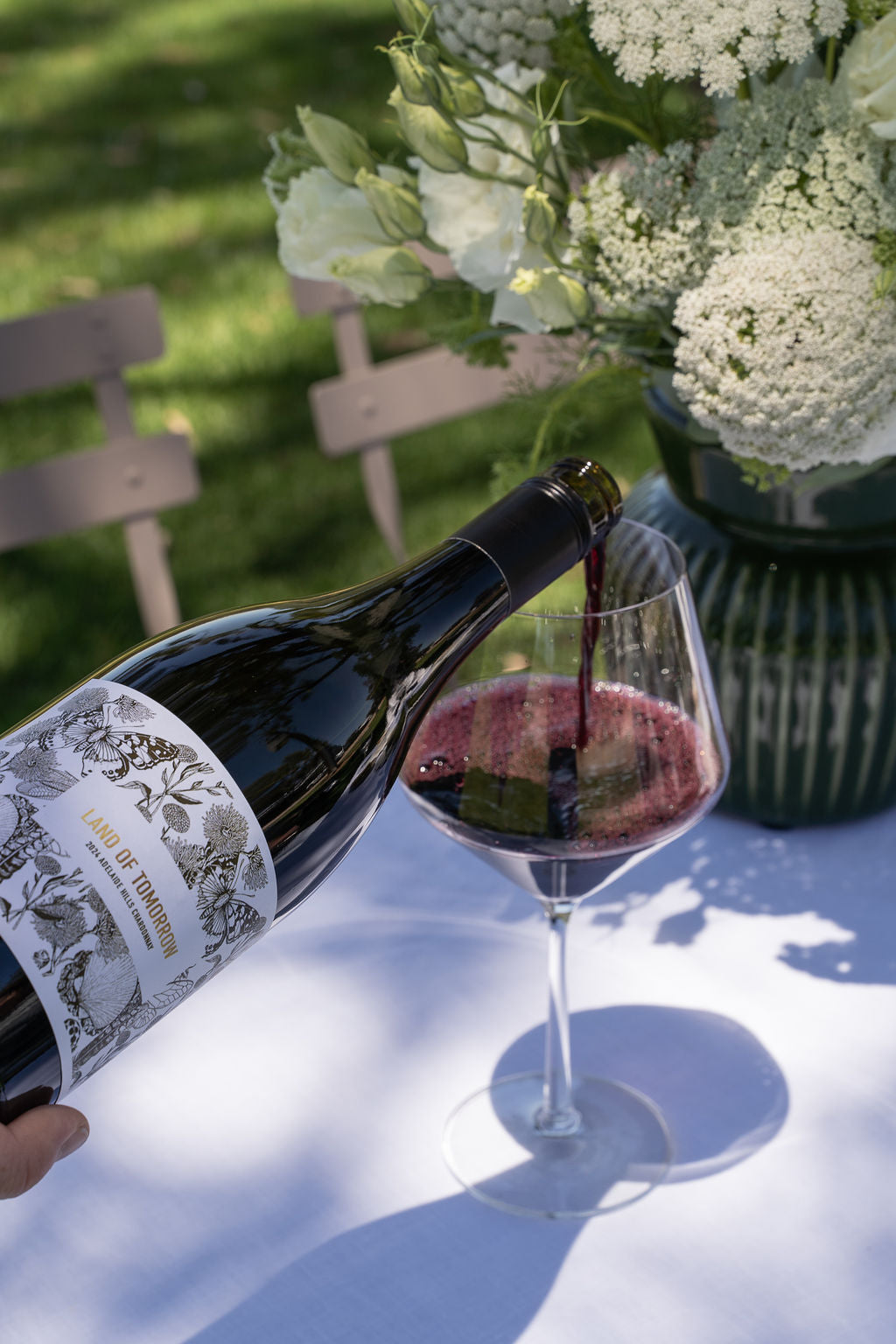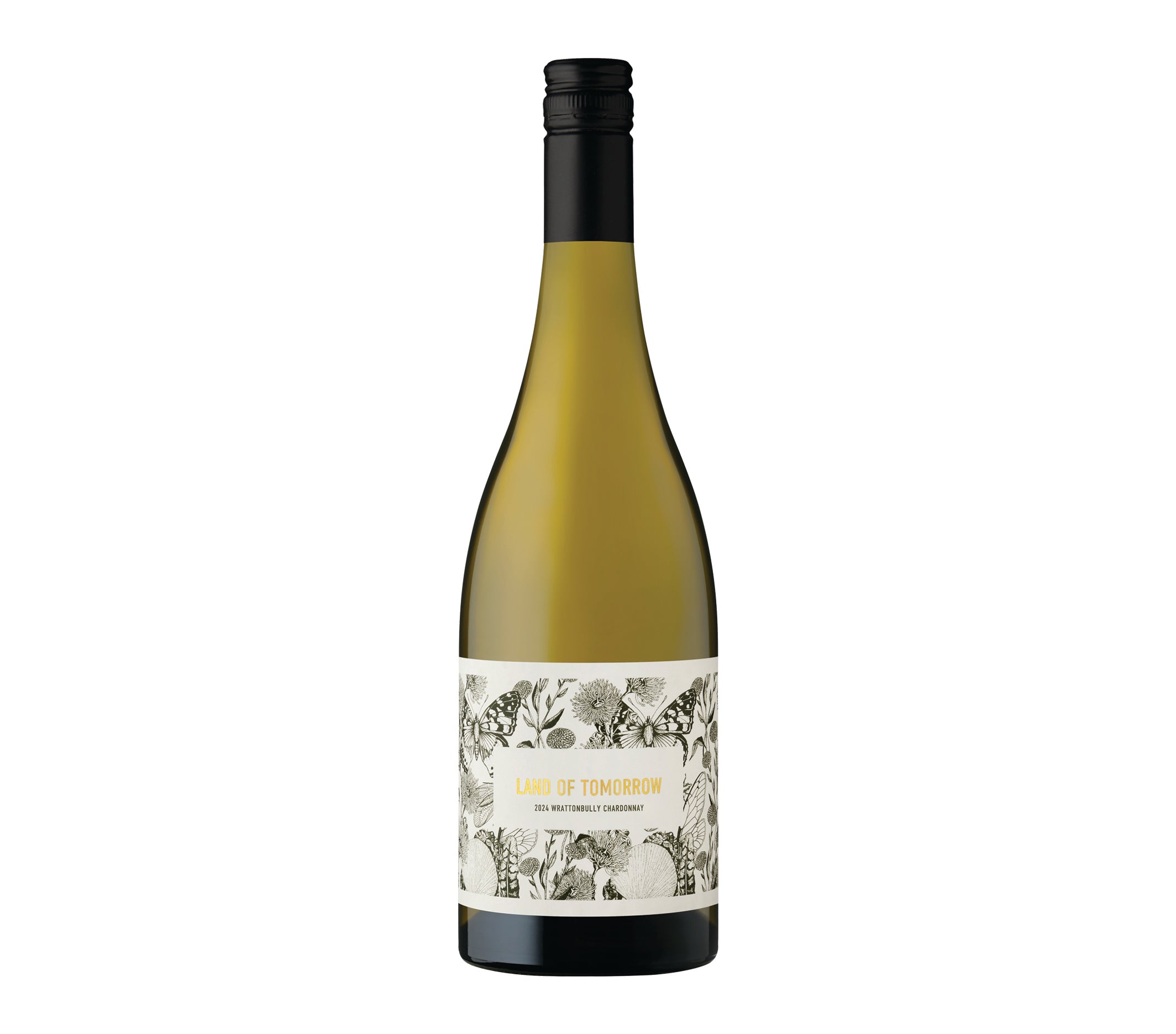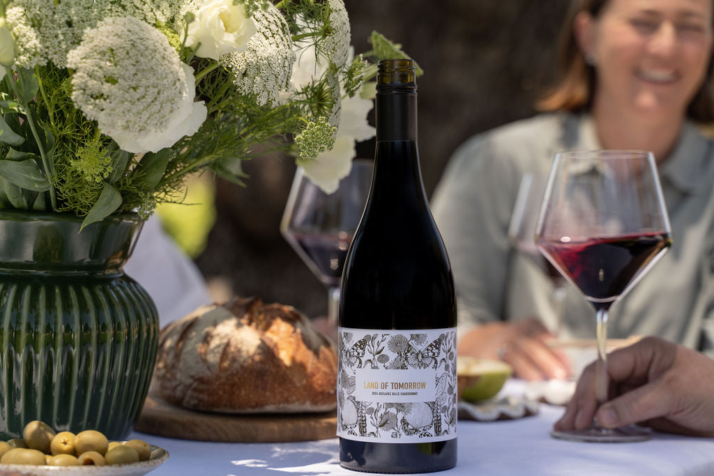 A bottle of 2024 Adelaide Hills Chardonnay from the Land of Tomorrow wine series, with a white label featuring floral graphics.